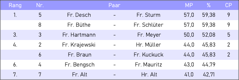 Clubturniere Ergebnis Clubturnier vom 20.08.2025 von Lars|Veröffentlicht am 21. August 2025 50 % = 48,0 MP