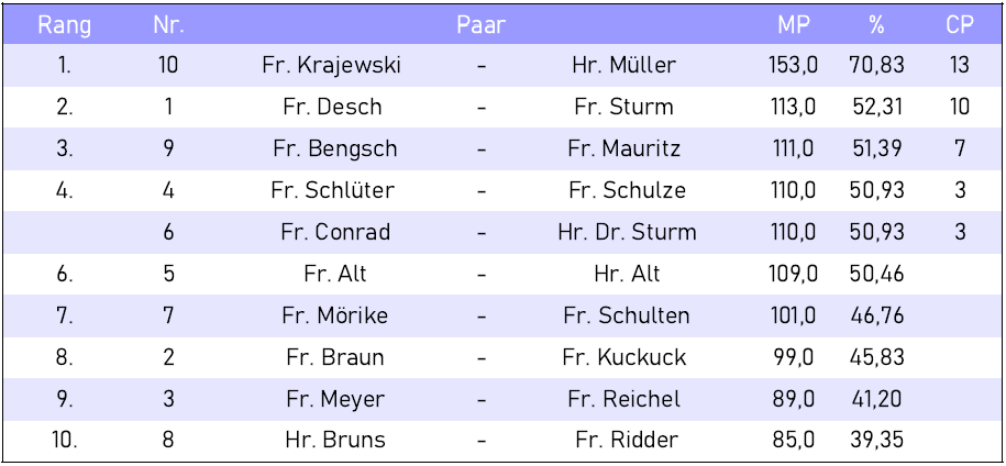 Clubturniere Ergebnis Clubturnier vom 12.11.2025 von Lars|Veröffentlicht am 12. November 2025 50 % = 108,0 MP